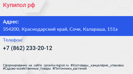 Купипол.рф по адресу 354200, Краснодарский край, Сочи, Калараша, 151а в дальнейшем Организация, размещена в следующих категориях: