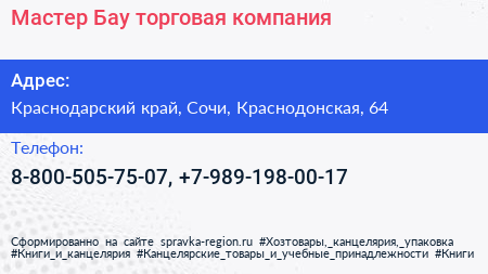 Мастер Бау, торговая компания по адресу Краснодарский край, Сочи, Краснодонская, 64 в дальнейшем Организация, размещена в следующих категориях: