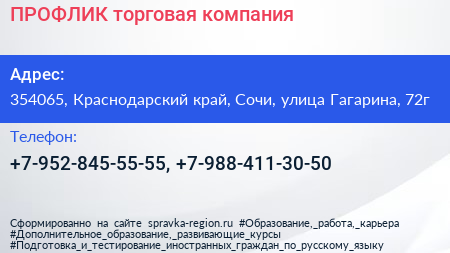ПРОФЛИК, торговая компания по адресу 354065, Краснодарский край, Сочи, улица Гагарина, 72г в дальнейшем Организация, размещена в следующих категориях: