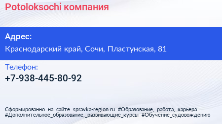Potoloksochi, компания по адресу Краснодарский край, Сочи, Пластунская, 81 в дальнейшем Организация, размещена в следующих категориях: