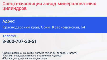 Спецтехизоляция, завод минераловатных цилиндров по адресу Краснодарский край, Сочи, Краснодонская, 64 в дальнейшем Организация, размещена в следующих категориях: