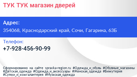 ТУК-ТУК, магазин дверей по адресу 354068, Краснодарский край, Сочи, Гагарина, 63Б в дальнейшем Организация, размещена в следующих категориях: