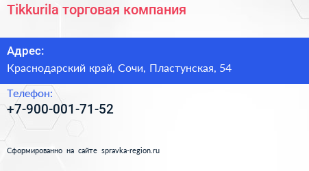 Tikkurila, торговая компания по адресу Краснодарский край, Сочи, Пластунская, 54 в дальнейшем Организация, размещена в следующих категориях: