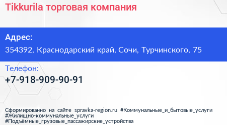 Tikkurila, торговая компания по адресу 354392, Краснодарский край, Сочи, Турчинского, 75 в дальнейшем Организация, размещена в следующих категориях: