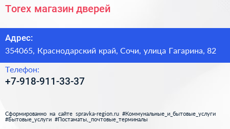 Torex, магазин дверей по адресу 354065, Краснодарский край, Сочи, улица Гагарина, 82 в дальнейшем Организация, размещена в следующих категориях: