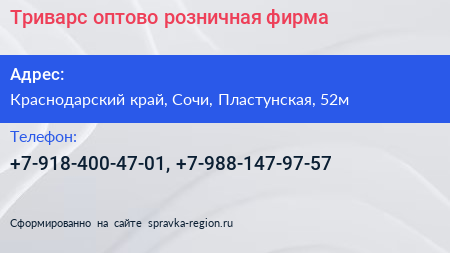 Триварс, оптово-розничная фирма по адресу Краснодарский край, Сочи, Пластунская, 52м в дальнейшем Организация, размещена в следующих категориях: