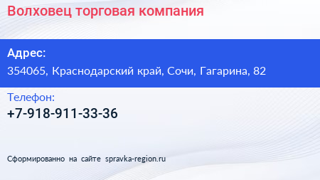 Волховец, торговая компания по адресу 354065, Краснодарский край, Сочи, Гагарина, 82 в дальнейшем Организация, размещена в следующих категориях: