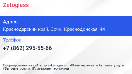 Zetoglass по адресу Краснодарский край, Сочи, Краснодонская, 44 в дальнейшем Организация, размещена в следующих категориях: