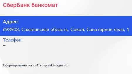 СберБанк, банкомат по адресу 693903, Сахалинская область, Сокол, Санаторное село, 1 в дальнейшем Организация, размещена в следующих категориях: