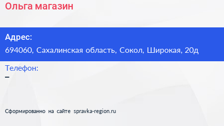 Ольга, магазин по адресу 694060, Сахалинская область, Сокол, Широкая, 20д в дальнейшем Организация, размещена в следующих категориях: