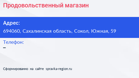Продовольственный магазин по адресу 694060, Сахалинская область, Сокол, Южная, 59 в дальнейшем Организация, размещена в следующих категориях: