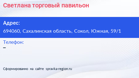 Светлана, торговый павильон по адресу 694060, Сахалинская область, Сокол, Южная, 59/1 в дальнейшем Организация, размещена в следующих категориях: