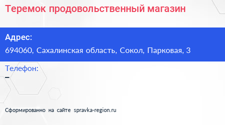 Теремок, продовольственный магазин по адресу 694060, Сахалинская область, Сокол, Парковая, 3 в дальнейшем Организация, размещена в следующих категориях: