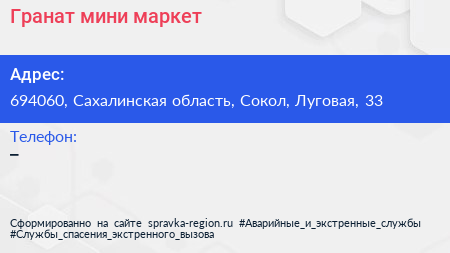 Гранат, мини-маркет по адресу 694060, Сахалинская область, Сокол, Луговая, 33 в дальнейшем Организация, размещена в следующих категориях: