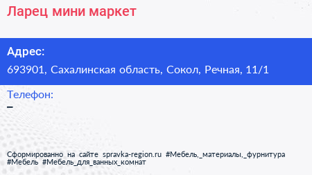 Ларец, мини-маркет по адресу 693901, Сахалинская область, Сокол, Речная, 11/1 в дальнейшем Организация, размещена в следующих категориях:
