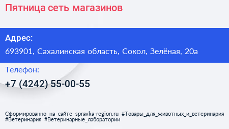 Пятница, сеть магазинов по адресу 693901, Сахалинская область, Сокол, Зелёная, 20а в дальнейшем Организация, размещена в следующих категориях:
