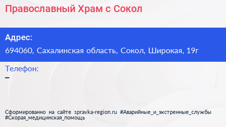 Православный Храм, с. Сокол по адресу 694060, Сахалинская область, Сокол, Широкая, 19г в дальнейшем Организация, размещена в следующих категориях: