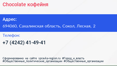 Chocolate, кофейня по адресу 694060, Сахалинская область, Сокол, Лесная, 2 в дальнейшем Организация, размещена в следующих категориях: