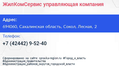 ЖилКомСервис, управляющая компания по адресу 694060, Сахалинская область, Сокол, Лесная, 2 в дальнейшем Организация, размещена в следующих категориях: