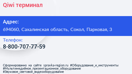 Qiwi, терминал по адресу 694060, Сахалинская область, Сокол, Парковая, 3 в дальнейшем Организация, размещена в следующих категориях: