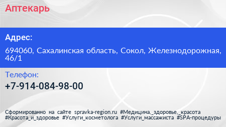 Аптекарь по адресу 694060, Сахалинская область, Сокол, Железнодорожная, 46/1 в дальнейшем Организация, размещена в следующих категориях: