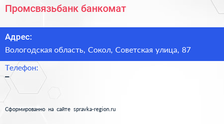 Промсвязьбанк, банкомат по адресу Вологодская область, Сокол, Советская улица, 87 в дальнейшем Организация, размещена в следующих категориях: