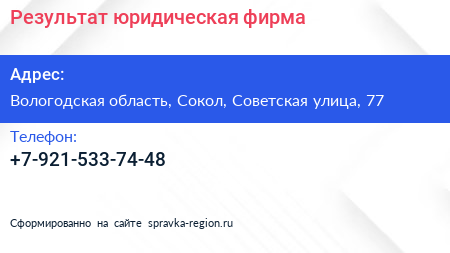 Результат, юридическая фирма по адресу Вологодская область, Сокол, Советская улица, 77 в дальнейшем Организация, размещена в следующих категориях:
