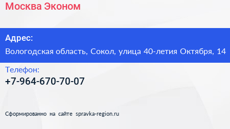 Москва-Эконом по адресу Вологодская область, Сокол, улица 40-летия Октября, 14 в дальнейшем Организация, размещена в следующих категориях: