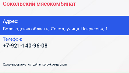 Сокольский мясокомбинат по адресу Вологодская область, Сокол, улица Некрасова, 1 в дальнейшем Организация, размещена в следующих категориях:
