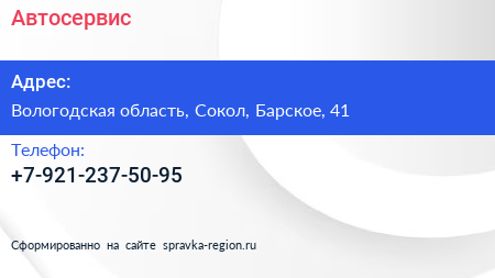 Автосервис по адресу Вологодская область, Сокол, Барское, 41 в дальнейшем Организация, размещена в следующих категориях: