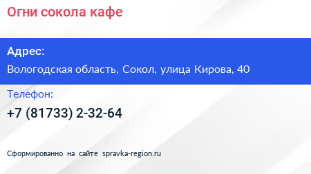 Огни сокола, кафе по адресу Вологодская область, Сокол, улица Кирова, 40 в дальнейшем Организация, размещена в следующих категориях: