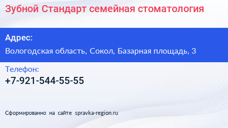 Зубной Стандарт, семейная стоматология по адресу Вологодская область, Сокол, Базарная площадь, 3 в дальнейшем Организация, размещена в следующих категориях: