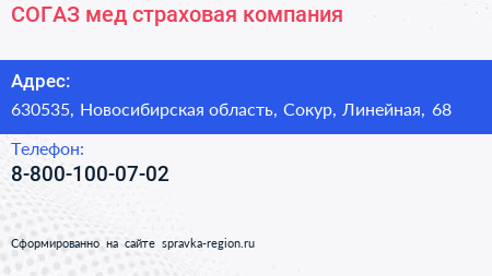 СОГАЗ-мед, страховая компания по адресу 630535, Новосибирская область, Сокур, Линейная, 68 в дальнейшем Организация, размещена в следующих категориях: