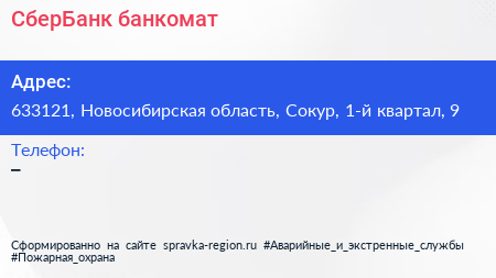 СберБанк, банкомат по адресу 633121, Новосибирская область, Сокур, 1-й квартал, 9 в дальнейшем Организация, размещена в следующих категориях: