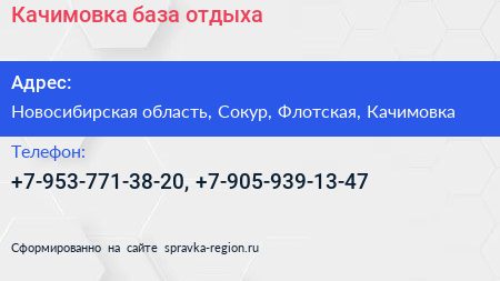 Качимовка, база отдыха по адресу Новосибирская область, Сокур, Флотская, Качимовка в дальнейшем Организация, размещена в следующих категориях:
