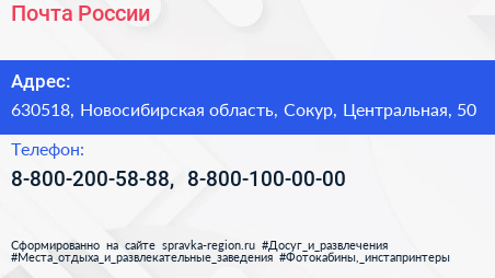Почта России по адресу 630518, Новосибирская область, Сокур, Центральная, 50 в дальнейшем Организация, размещена в следующих категориях: