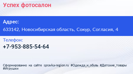 Успех, фотосалон по адресу 633142, Новосибирская область, Сокур, Согласия, 4 в дальнейшем Организация, размещена в следующих категориях: