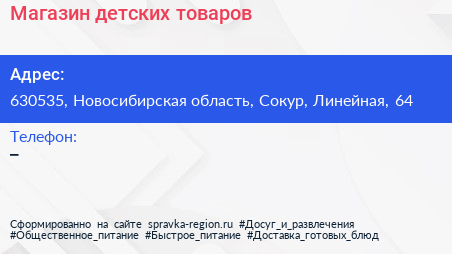 Магазин детских товаров по адресу 630535, Новосибирская область, Сокур, Линейная, 64 в дальнейшем Организация, размещена в следующих категориях: