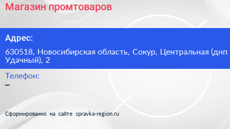 Магазин промтоваров по адресу 630518, Новосибирская область, Сокур, Центральная (днп Удачный), 2 в дальнейшем Организация, размещена в следующих категориях: