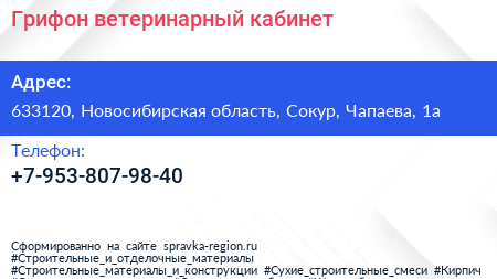 Грифон, ветеринарный кабинет по адресу 633120, Новосибирская область, Сокур, Чапаева, 1а в дальнейшем Организация, размещена в следующих категориях: