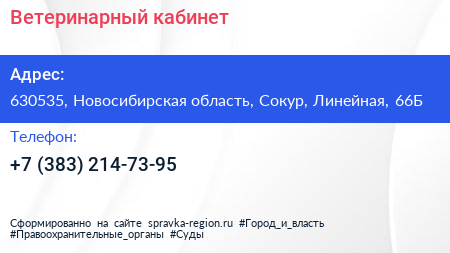 Ветеринарный кабинет по адресу 630535, Новосибирская область, Сокур, Линейная, 66Б в дальнейшем Организация, размещена в следующих категориях: