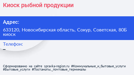 Киоск рыбной продукции по адресу 633120, Новосибирская область, Сокур, Советская, 80Б киоск в дальнейшем Организация, размещена в следующих категориях: