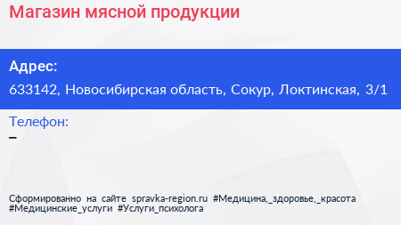 Магазин мясной продукции по адресу 633142, Новосибирская область, Сокур, Локтинская, 3/1 в дальнейшем Организация, размещена в следующих категориях: