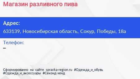 Магазин разливного пива по адресу 633139, Новосибирская область, Сокур, Победы, 18а в дальнейшем Организация, размещена в следующих категориях: