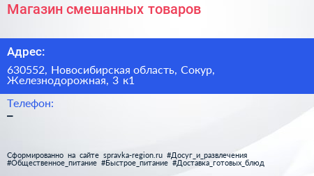 Магазин смешанных товаров по адресу 630552, Новосибирская область, Сокур, Железнодорожная, 3 к1 в дальнейшем Организация, размещена в следующих категориях: