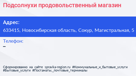 Подсолнухи, продовольственный магазин по адресу 633415, Новосибирская область, Сокур, Магистральная, 5 в дальнейшем Организация, размещена в следующих категориях: