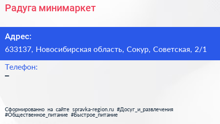 Радуга, минимаркет по адресу 633137, Новосибирская область, Сокур, Советская, 2/1 в дальнейшем Организация, размещена в следующих категориях: