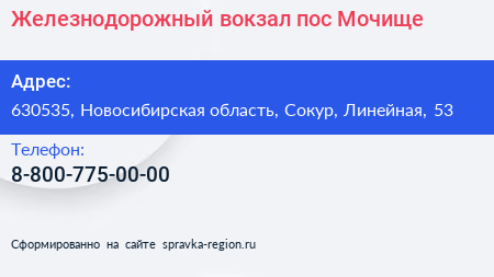 Железнодорожный вокзал, пос. Мочище по адресу 630535, Новосибирская область, Сокур, Линейная, 53 в дальнейшем Организация, размещена в следующих категориях: