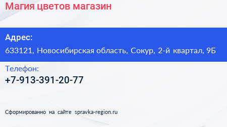 Магия цветов, магазин по адресу 633121, Новосибирская область, Сокур, 2-й квартал, 9Б в дальнейшем Организация, размещена в следующих категориях: