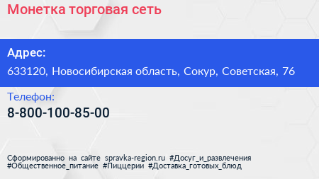 Монетка, торговая сеть по адресу 633120, Новосибирская область, Сокур, Советская, 76 в дальнейшем Организация, размещена в следующих категориях:
